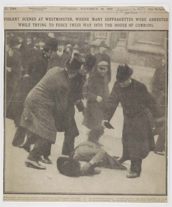 The anonymous woman who reported these acts of police brutality was one of 300 British suffragists peacefully marching before the House of Commons on November 18, 1910. Journalist Henry Noel Brailsford and Dr. Jessie Murray took 135 statements from activists and eyewitnesses describing how police beat the suffragists with batons, punched, kicked, dragged, choked, stripped, and sexually assaulted them. One officer hurled a woman at a lamppost, loosening two of her teeth. Brailsford and Murray wrote:
