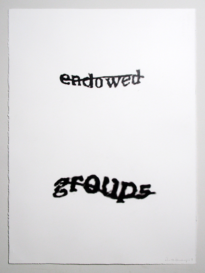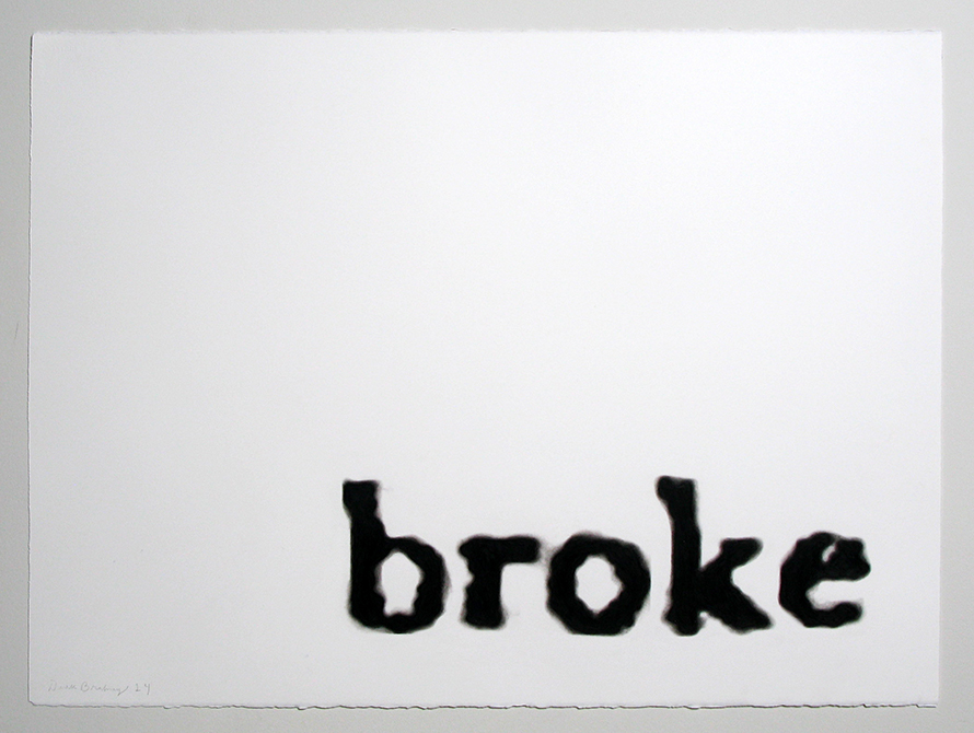Brahney's CAPTCHA series is named after the test that secure websites provide to determine whether you are a human or a robot. The acronym stands for Completely Automated Public Turing test to tell Computers and Humans Apart. While the words can sometimes be hard to read, they can also be beautiful, and Brahney thinks of these works as "digital ready-mades." He reproduced these in a completely analog format: as large graphite drawings. However, the images eventually end up as digital again as jpegs on his website, which completes the circle of production.