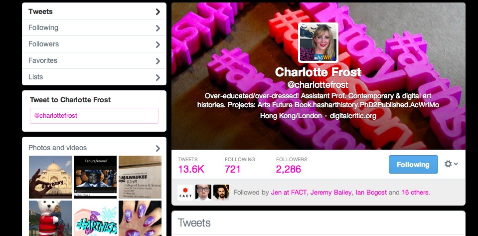 Dr Charlotte Frost is an academic focusing on art’s relationship with technology. Producing reviews and discussion on digital/new media art for more than ten years, she has worked online and off with a variety of key organisations including the Guardian, Arts Council England, Furtherfield, where she is Associate Context Editor, Rhizome and a-n, where she wrote the regular column: Digital Practices. A presenter on the radio show Furtherfield.org on Resonance FM, she also recently co-produced and presented a set of videos on social media for creatives, and contributed to the Guardian video on Jill Magid’s Tate Modern show. She is founder and editor of the research project and academic book series, Arts Future Book, which looks at how digital creativity challenges the form and content of the art history/criticism/theory book. A member of the CAA Committee on Intellectual Property, she is also the founder and director of PhD2Published, a web resource offering publishing advice to early-career academics. Her own first book, Art History Online, comes out in 2013. She has taught at Writtle School of Design, the University of Westminster, completed a short-term Post Doctoral Fellowship at the prestigious HUMlab in Sweden, and is the 2011-2012 International Post-Doctoral Research Fellow at the Center for 21st Century Studies at the University of Wisconsin-Milwaukee.