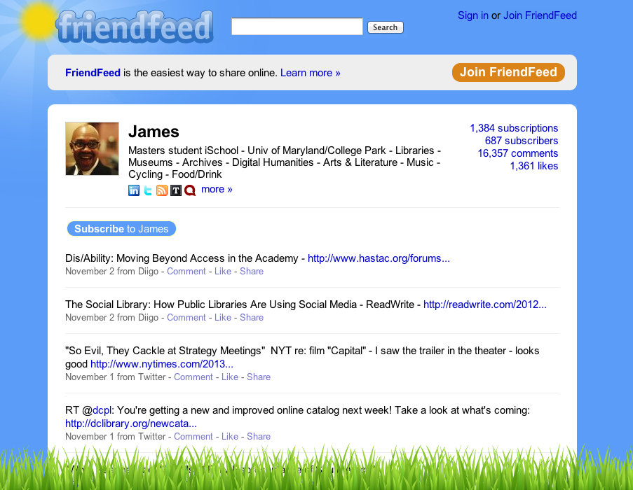 "Twitter - I was an early adopter on Twitter in August of 2007. I am a big fan of Twitter lists and have divided the 5000+ accounts I follow on Twitter into several lists centered around library and information science, public media, music, arts and literature, and global affairs."