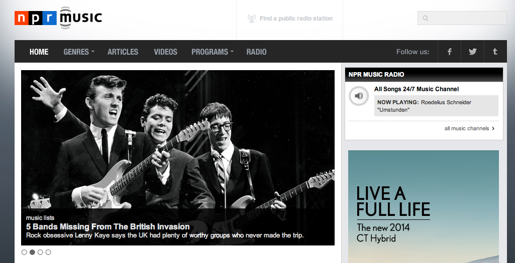 "NPR Music - I am a big fan of music and a big fan of NPR. There are few organizations covering music as well as NPR. I am especially a fan of their jazz blog 'A Blog Supreme'."