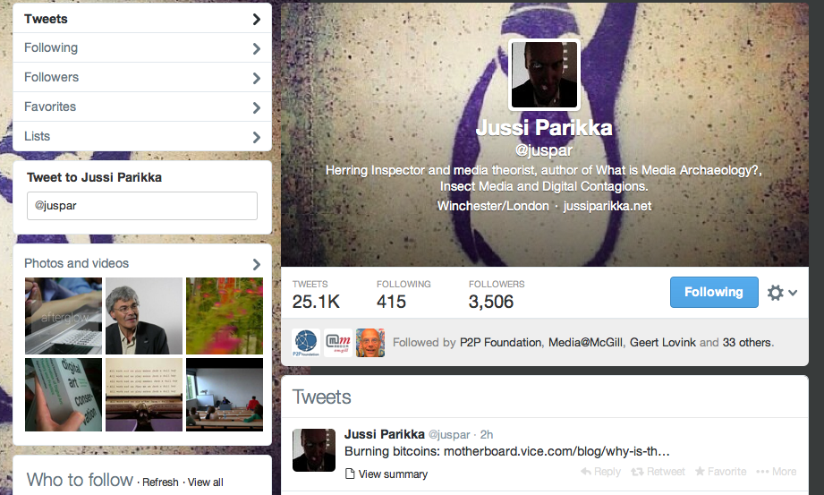 Jussi Parikka is a London based Finnish media theorist. He works at Winchester School of Art as Reader in Media & Design. Parikka writes on media from a historical, but slightly twisted perspective: his books include work on computer viruses (Digital Contagions, 2007), insects (Insect Media, 2010) and on media archaeological methods (What is Media Archaeology 2012, and the with Erkki Huhtamo co-edited Media Archaeology, 2011). In addition, he co-edited with Tony Sampson a book on "spam, porn and other anomalous objects of digital culture" (The Spam Book, 2009).