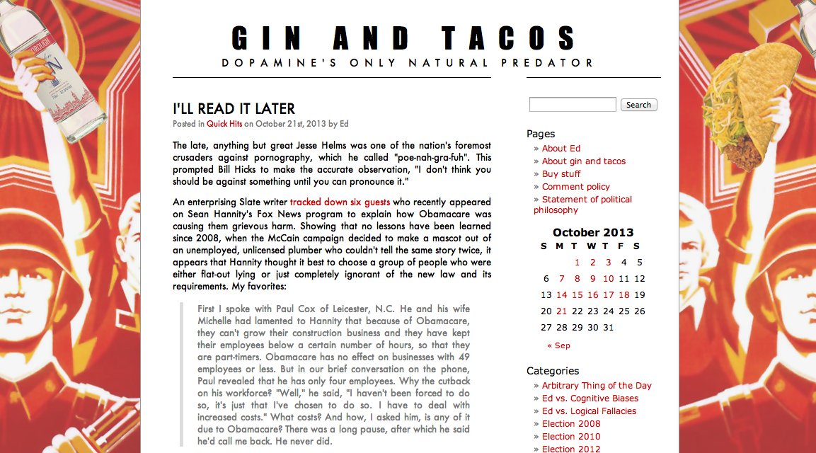 "Political scientist "Ed," at Gin and Tacos, is brilliant, funny, and doesn't pull punches. I learn a lot from him and laugh too."