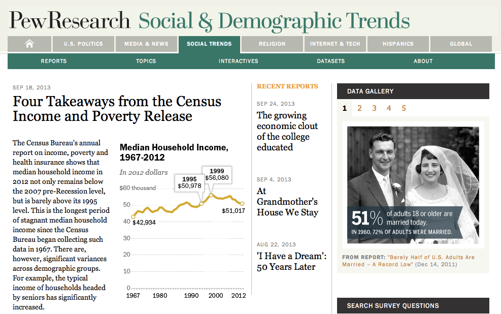 "Pew Social Trends releases data on U.S. demographics, behavior, and opinion. It's easy to read and very visual."