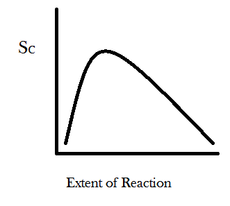 For the simple reaction A + B → C the entropy is maximized at about 29% completion. For different reactions with different ratios of reactants to products the configurational entropy will be maximized at different percents of completion. Also keep in mind that the systems true equilibrium (maximum entropy) can only be found by taking into account the change in the number of energetic microstates as well. The point I would like you to take away from this graph is that the slope of the curve is always positive for small values of the extent of reaction and always negative for large values. The physical meaning of these asymptotic slopes is that matter-randomization considerations promote all chemical transformations through some compositional range. Undergraduate chemistry students are taught this lesson as a particular instance of “Le Chatelier’s Principle.”