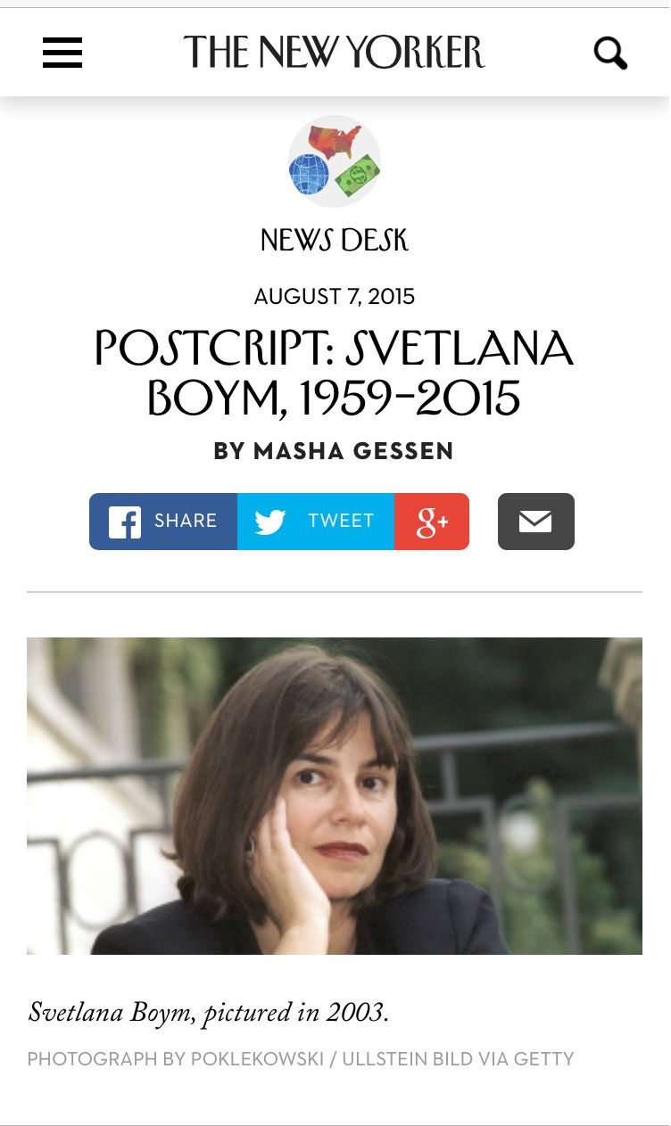 In a recent New Yorker obituary, Masha Gesson celebrates the kaleidoscopic life of her friend Svetlana Boym, a woman of letters and of photographs. She was also my professor. I walked into her class by accident and I stayed.