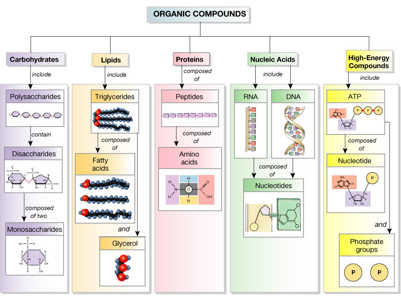 Everyone knows more than they think they do about biochemistry already because, after all, we are what we eat. So to begin with, almost all of the molecules inside any living thing can be classified as either carbohydrate, protein, lipid or nucleic acid. Here’s a helpful diagram:
